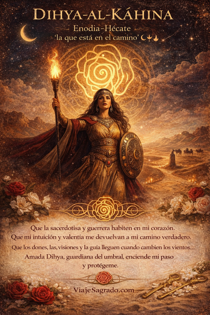 Una tablilla representaba a Enodia, antigua forma de Hécate: la que está en el cruce de caminos, la psicopompa, mediadora entre mundos, señora de las encrucijadas. Su energía se hizo presente. También Dihya al-Kāhina, reina amazig que vivió y luchó por su pueblo, cuya voz ancestral resonó como mensaje profético.